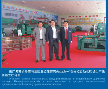 來(lái)廠(chǎng)考察的外商與集團(tuán)總經(jīng)理郭亮先生(左一)在光控自動(dòng)化磚機(jī)生產(chǎn)線(xiàn)展銷(xiāo)大廳合影